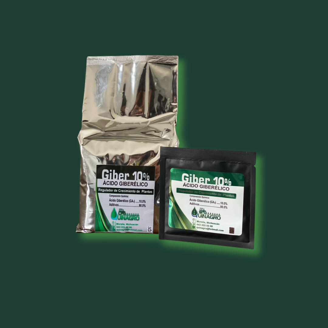 Es un regulador de crecimiento que ayuda a estimular y regular el desarrollo de las plantas, nos ayuda a aumentar el crecimiento de los tallos, la germinación de las semillas e induce a la brotación de yemas, controla el tamaño y la calidad de los frutos.